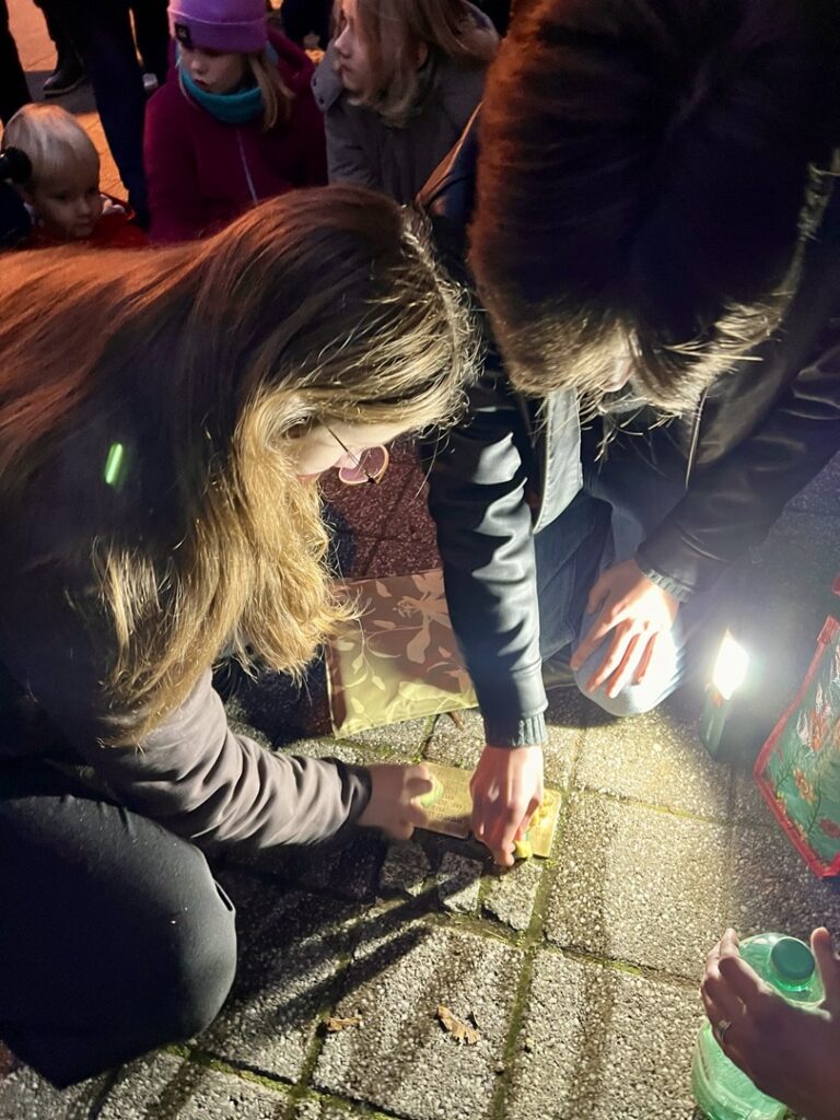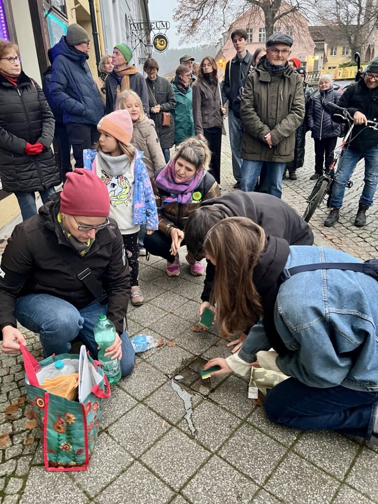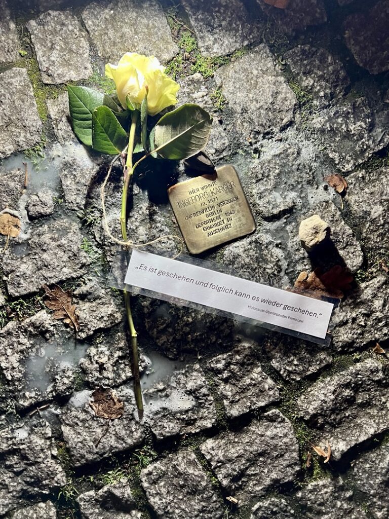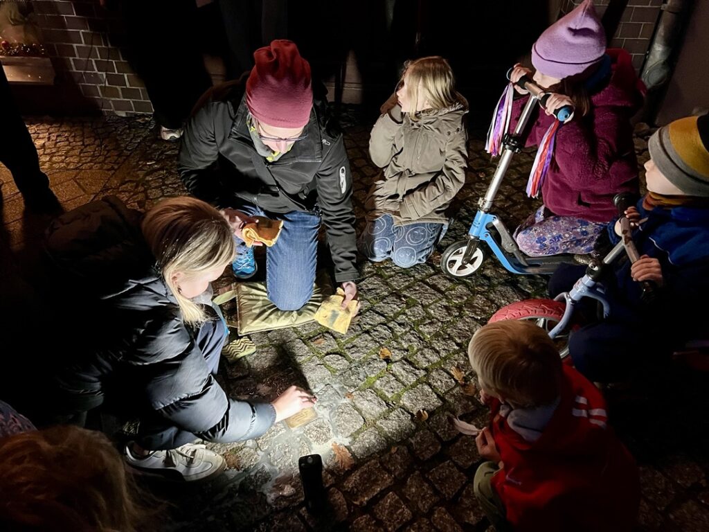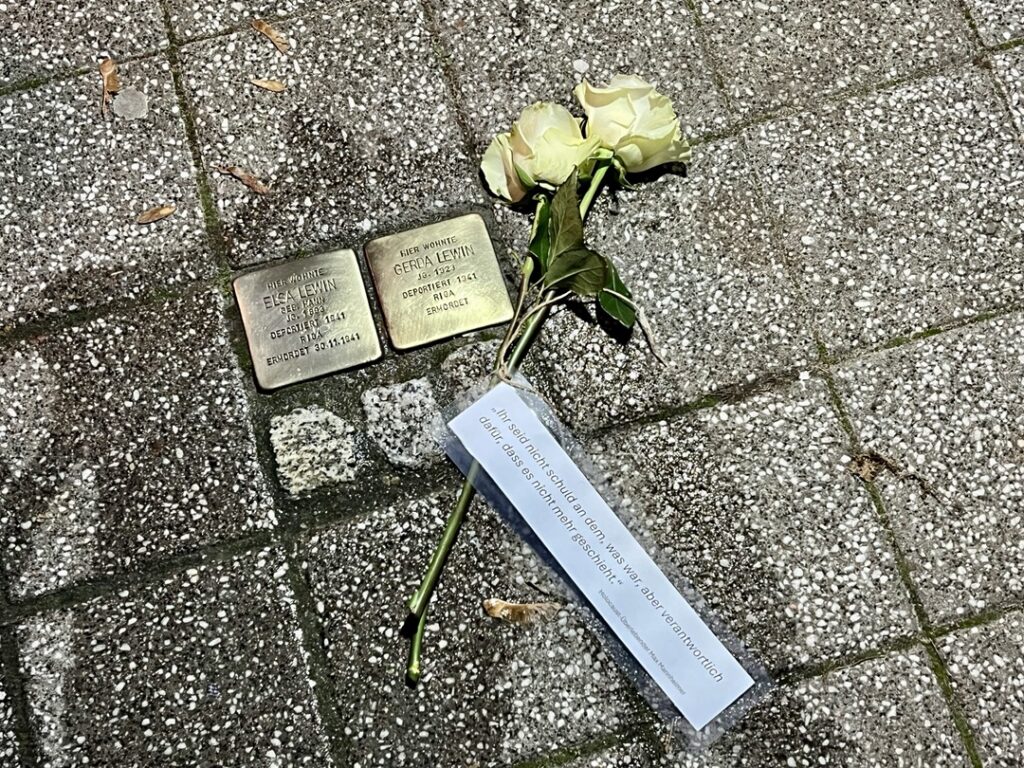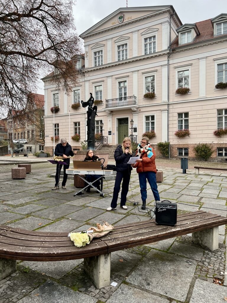Nach einer musikalischen Eröffnung durch das Quartett à nett führte der Rundgang vom Marktplatz über mehrere Stolpersteine bis zur ehemaligen Synagoge in der Fischerstraße. An den Stationen wurden Texte, Reden und Zitate vorgetragen, Stolpersteine gereinigt und Rosen niedergelegt – stille Zeichen gegen das Vergessen. Zahlreiche Bürgerinnen und Bürger, darunter viele Familien mit Kindern, nahmen teil und setzten gemeinsam ein sichtbares Zeichen für Mitmenschlichkeit und Verantwortung.