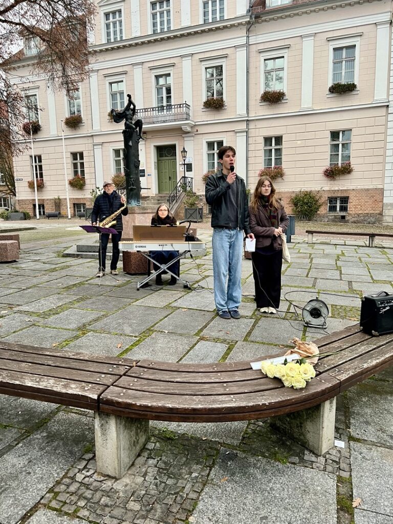 Am 9. November 2025 um 16 Uhr lud die Initiative „Bad Freienwalde ist bunt“ zum dritten Stolperstein-Rundgang durch die Stadt ein, um an die Opfer der Novemberpogrome von 1938 zu erinnern. Zum ersten Mal wirkten dabei Schülerinnen und Schüler aus dem 12. Jahrgang des Gymnasiums „Bertolt Brecht“ in Bad Freienwalde und der Jugendakademie der Oberbarnim-Schulen in Eberswalde aktiv an der Gestaltung des Programms mit.