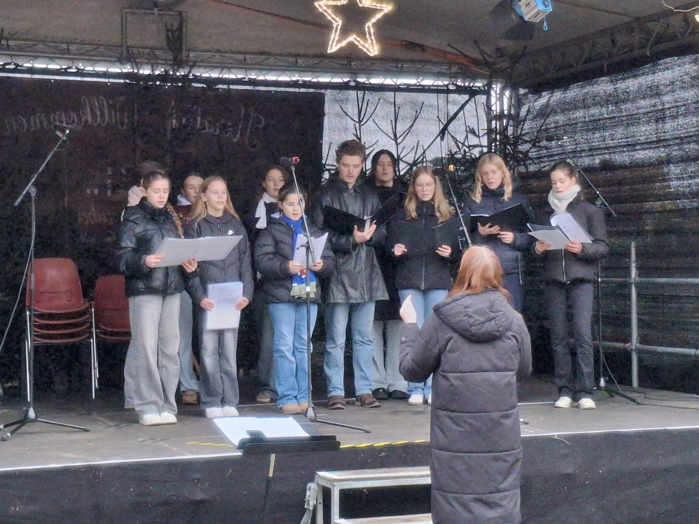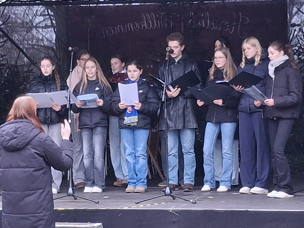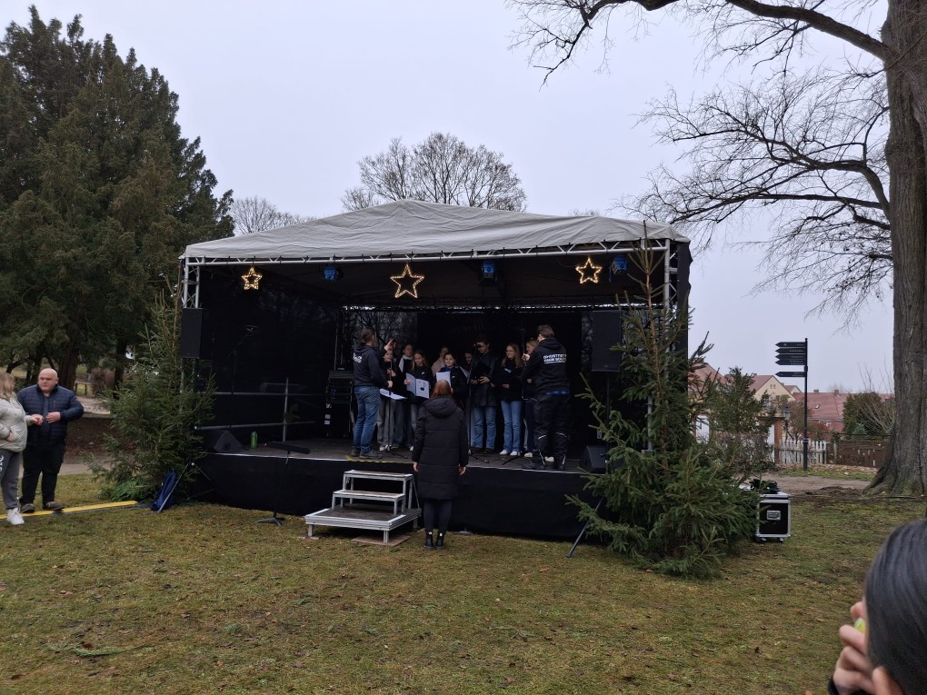Am Freitag, den 12.12.2025, war der Chor unserer Schule „SONUS“ eingeladen, den Weihnachtsmarkt im Schlosspark Bad Freienwalde musikalisch zu begleiten. Zum regen Treiben an den Ständen wurde es auf der Bühne weihnachtlich mit Liedern wie „Alle Jahre wieder“, „Sind die Lichter angezündet“ oder „Carol of the bells“.